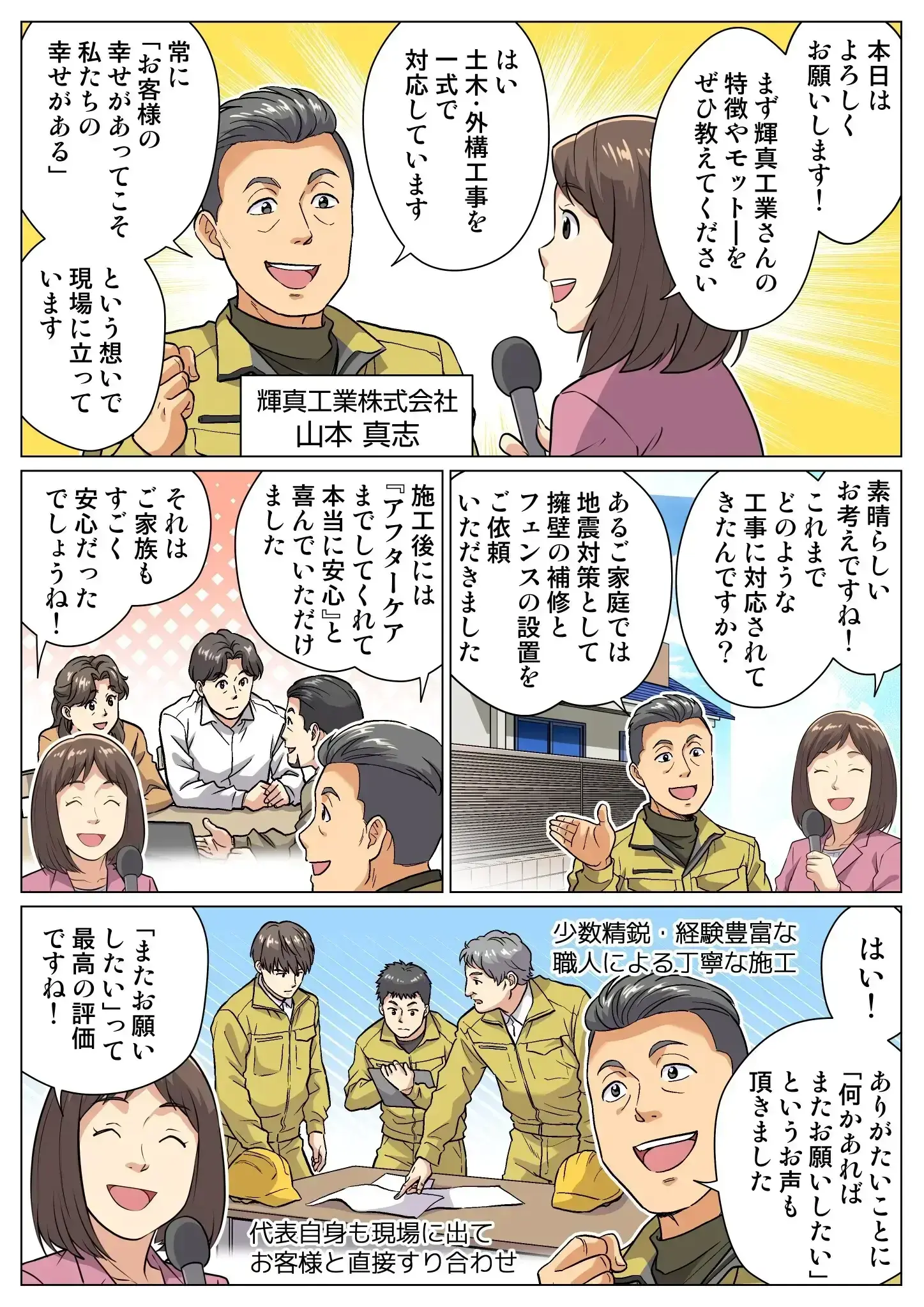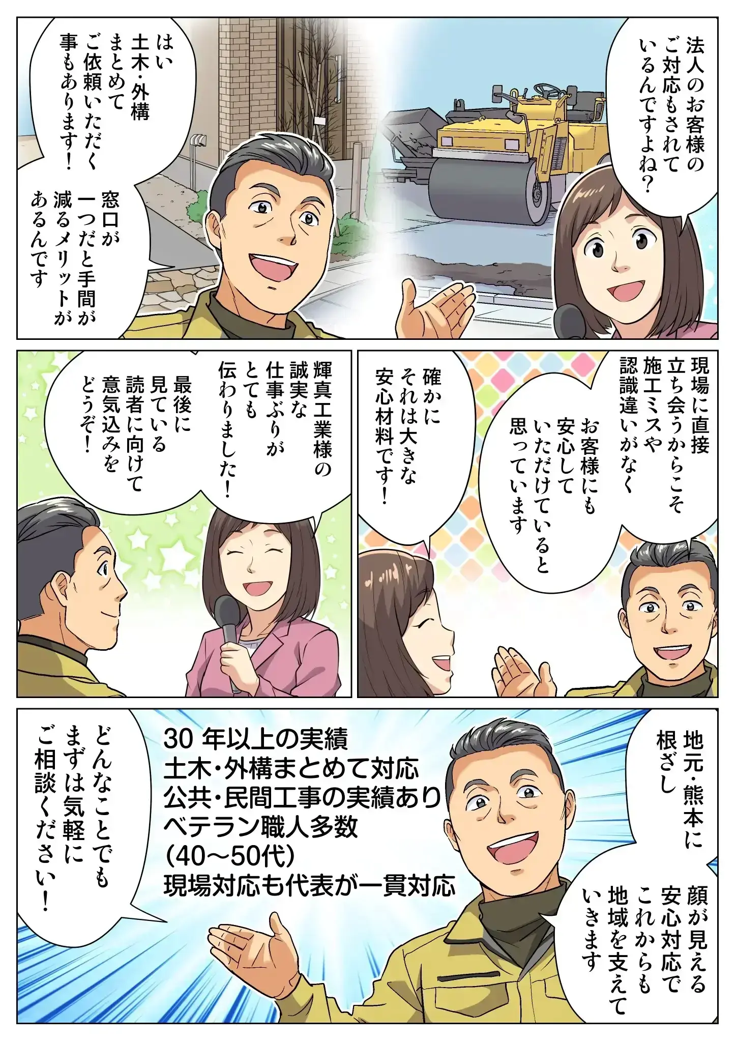 輝真工業は、熊本で30年以上、土木・外構工事を手がけてきました。責任施工でお客様に納得いただけるよう、ご要望を丁寧にお聞きし、相違がないよう丁寧な仕事を心がける。これが私たちの信念です。少数精鋭のベテラン職人が、チームワークを大切にし、お客様の大切な工事を一つひとつ誠実に仕上げています。これからも、地域の皆様に信頼される会社であり続けたいと思っています。