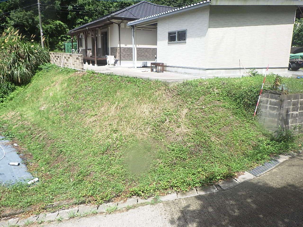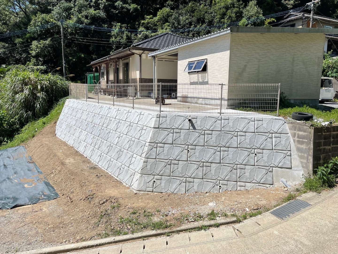 擁壁背面には適切な排水設備を設置し、雨水による土圧の増加を防止。地震や大雨にも強い安全な擁壁を実現しています。擁壁上部にはメッシュフェンスを設置し、防犯性も確保。傾斜地を安全で使いやすい平坦な敷地へと生まれ変わりました。